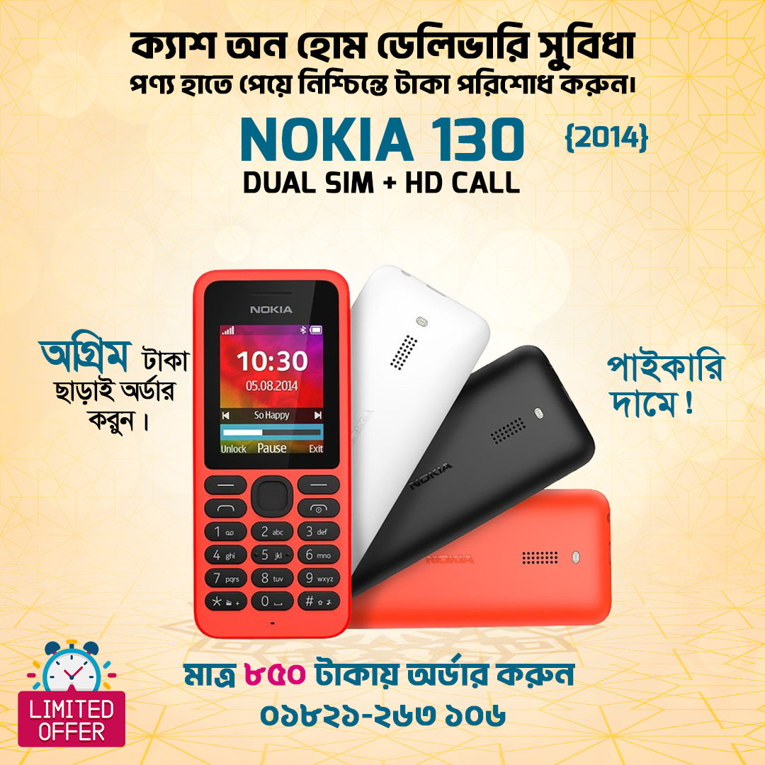 - Nokia 130 ২ সিম ও মেমোরী কার্ড সাপোর্টেড upto 2gb.
